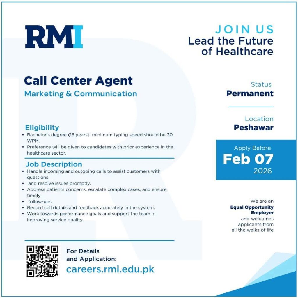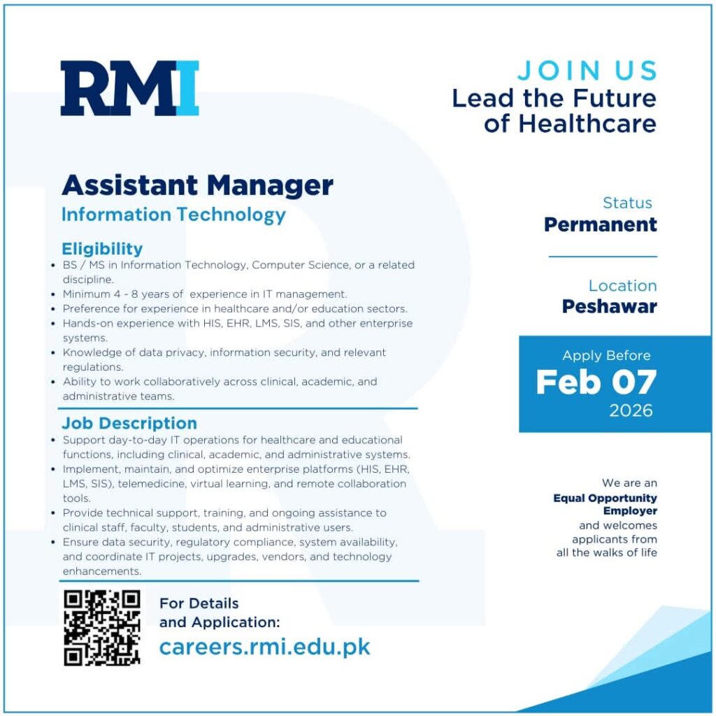 RMI Peshawar is hiring for Assistant Manager Information Technology and Call Center Agent positions. Check eligibility, qualifications, experience, and apply before Feb 07, 2026. Permanent jobs in healthcare sector.