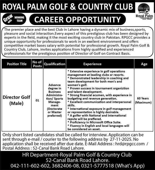 Royal Palm Golf Club Lahore seeks a Director Golf (Male) on contract. Advanced degree in Sports/Business Management & strong financial acumen required. Apply by 27-11-2025.