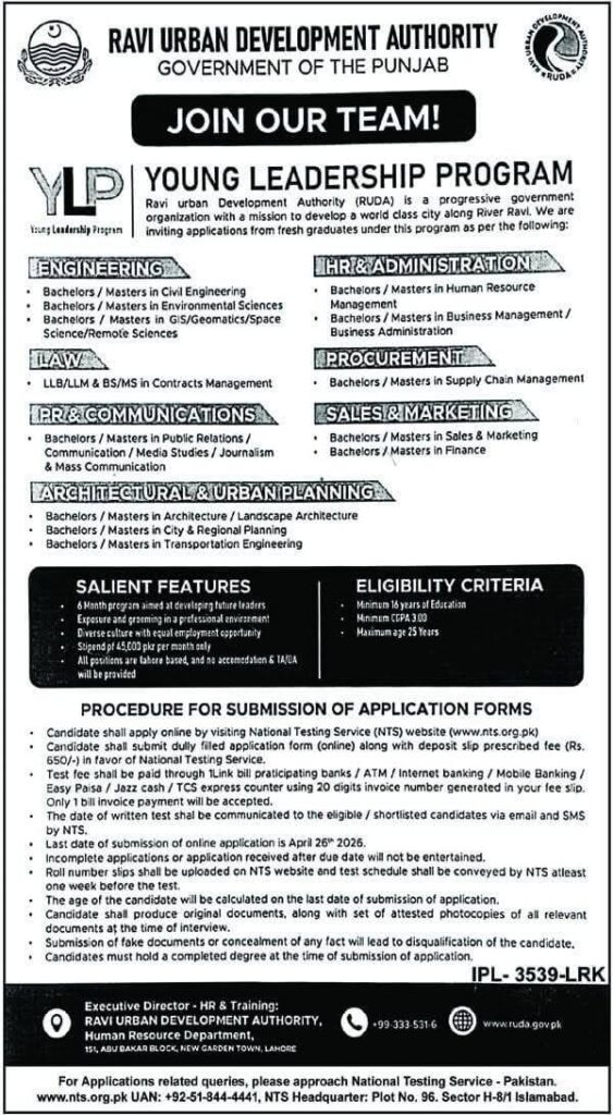 Join the Ravi Urban Development Authority (RUDA) Young Leadership Program 2026. Exciting internship opportunities for fresh graduates in Engineering, HR, Marketing, and Law. Monthly stipend of Rs. 45,000 offered. Apply online via NTS by April 26, 2026.