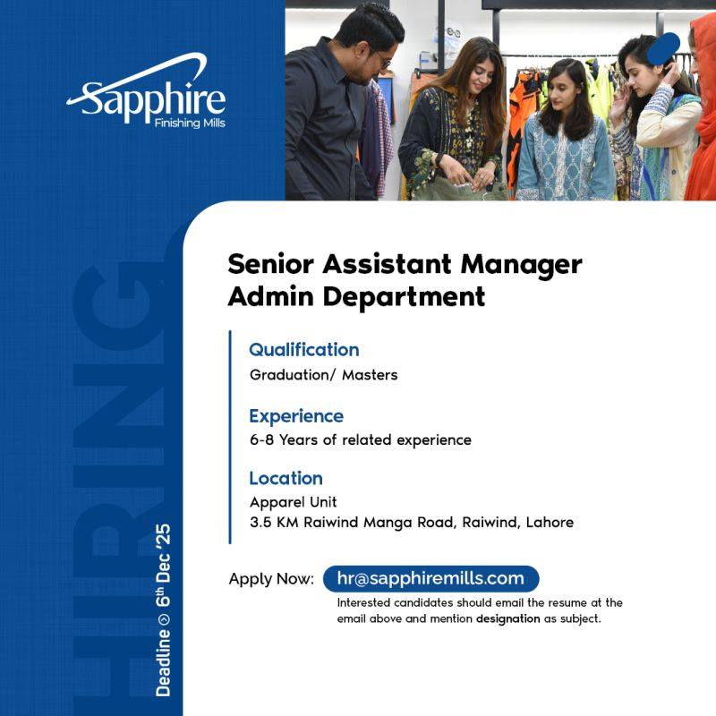 “Sapphire Finishing Mills is hiring for the Senior Assistant Manager position in the Admin Department. Apply by December 6, 2025. Ideal candidates should have 6-8 years of experience and a Graduation/Master’s degree. Competitive salary offered.”