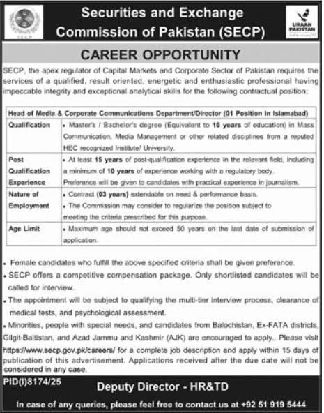 Apply for SECP jobs 2026 in Islamabad. Head of Media & Corporate Communications Director position available. Check qualifications, 15+ years experience requirement, age limit, and application details.