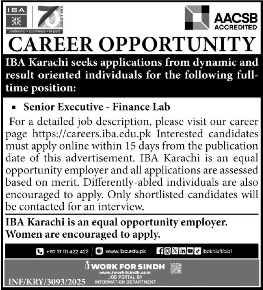 “Apply for the Senior Executive – Finance Lab position at IBA Karachi. Interested candidates must apply online within 15 days of the advertisement. IBA Karachi is an equal opportunity employer, encouraging diverse applications.”