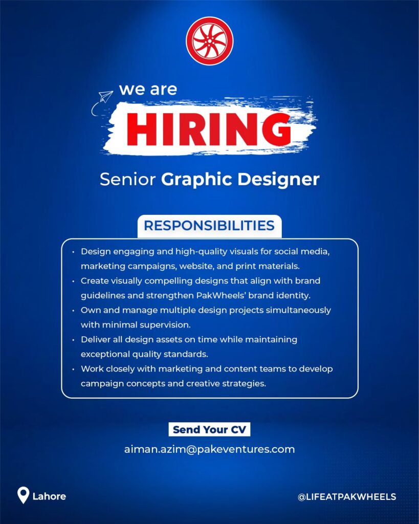 “PakWheels is hiring a Senior Graphic Designer in Lahore. The ideal candidate will create high-quality visuals for digital marketing campaigns, websites, and print materials. Apply now to join the creative team!”
