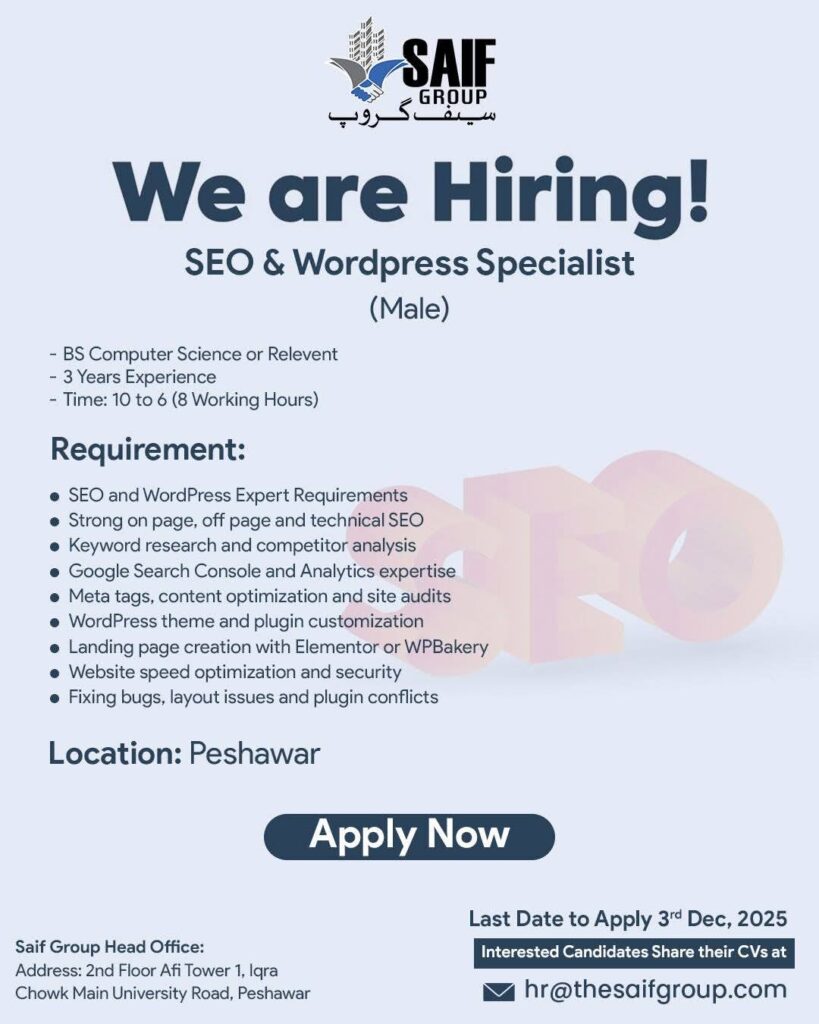 Apply for the SEO & WordPress Specialist position at Saif Group in Peshawar. Ideal for candidates with expertise in SEO, WordPress, Google Search Console, and website optimization. Apply by 3rd December 2025.