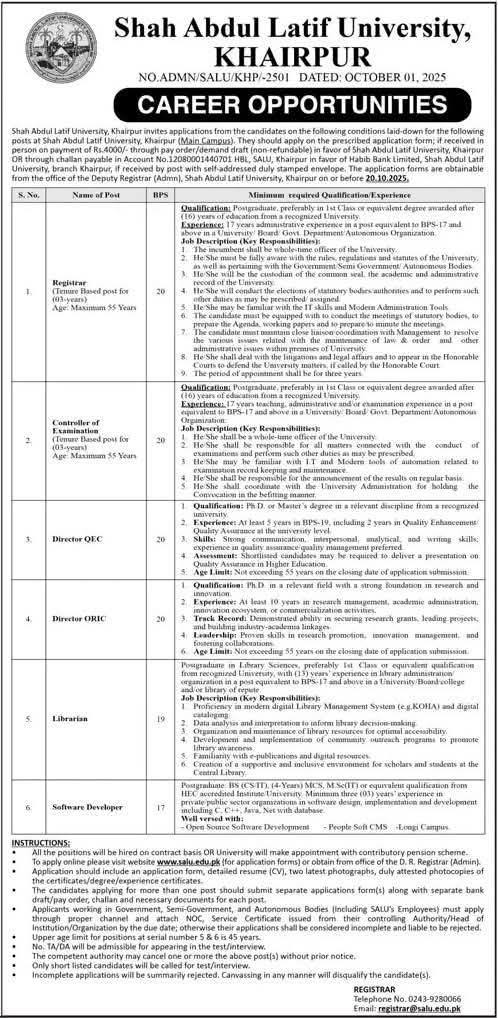 - Application Process: Interested candidates should submit the prescribed application form, along with their CV and required documents (attested copies of degrees, experience certificates, etc.) to the Deputy Registrar (Admin), Shah Abdul Latif University, Khairpur, by 20th October 2025.