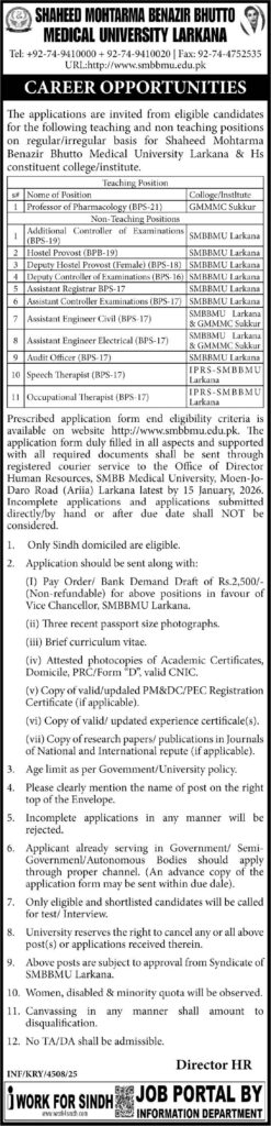 Apply for Shaheed Mohtarma Benazir Bhutto Medical University Larkana jobs 2025. Latest teaching and non-teaching vacancies including professors, engineers, and administrative staff. Check eligibility, posts, and application details.