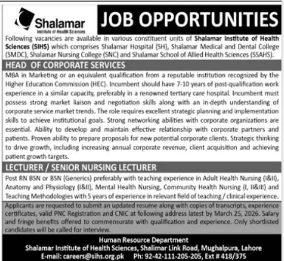 Apply for Shalamar Institute of Health Sciences jobs 2026 in Lahore. Vacancies for Head of Corporate Services and Nursing Lecturer roles. Check eligibility, qualifications, deadline, and application process.