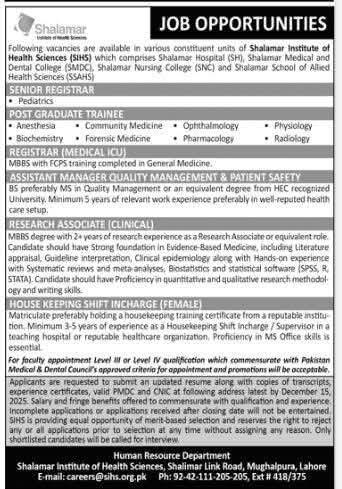 “Shalimar Institute of Health Sciences is hiring for multiple healthcare positions including Post Graduate Trainees, Senior Registrars, and Assistant Managers in Quality Management. Apply now for these healthcare job opportunities in Lahore.”