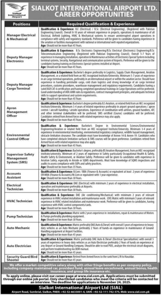 Sialkot International Airport Ltd. (SIAL) is hiring in engineering, management, and technical fields. Apply for Manager Electrical & Mechanical, Deputy Manager Cargo/Terminal, HVAC Technician, and Security Guard/Shooter. Requires relevant BE/B.Sc Engineering, MBA, or DAE with 2-10 years experience. Apply online by 24 NOV 2025.