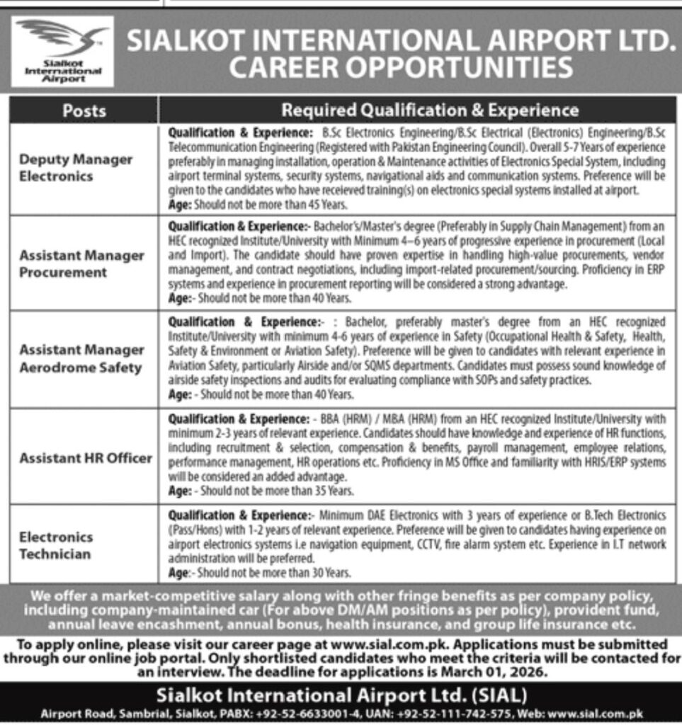 Apply for Sialkot International Airport Ltd (SIAL) jobs 2026 including Deputy Manager Electronics, Assistant Managers and Electronics Technician. Check qualifications, experience, age limits and apply before March 01, 2026.