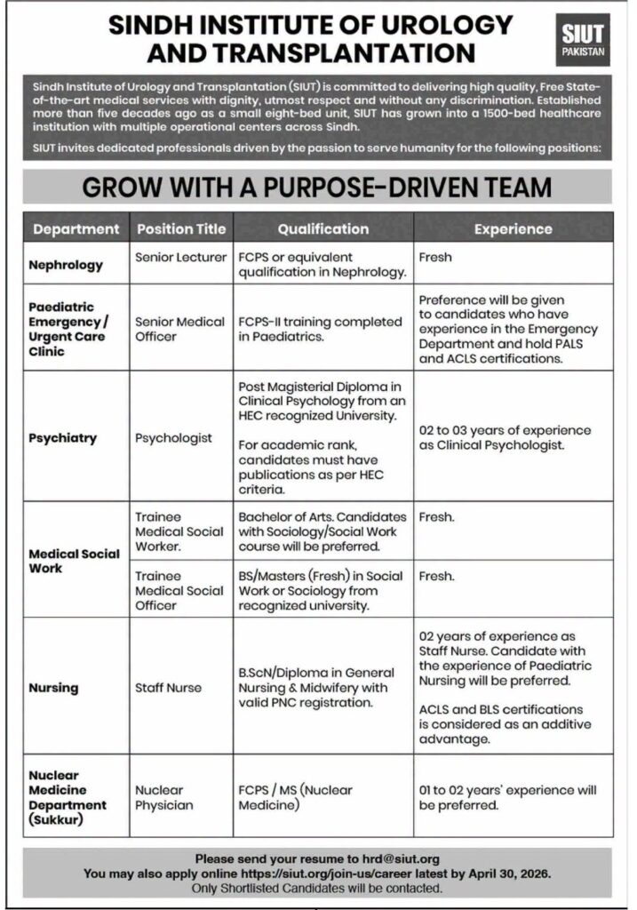 Apply for SIUT Karachi jobs 2026. Explore latest vacancies for nurses, psychologists, lecturers, and medical officers. Check qualifications, experience, eligibility, and deadline.