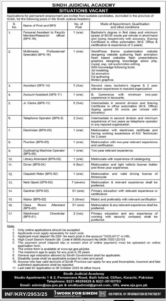 “Explore the latest job openings at Sindh Judicial Academy. Apply for positions such as Personal Assistant, Multimedia Professional, Jr. Clerk, Electrician, and more. Detailed job descriptions, qualifications, and application instructions included.”
