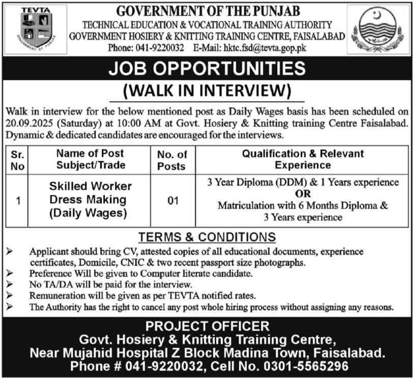 Looking for a Skilled Worker in Dress Making on a daily wage basis? Attend the walk-in interview at the Govt. Hosiery & Knitting Training Centre in Faisalabad on September 20, 2025, at 10:00 AM. Candidates with a relevant diploma and experience in dressmaking are encouraged to apply. This is an excellent opportunity to join a government-run training center offering competitive pay according to TEVTA rates. Learn more about the qualifications and requirements below.