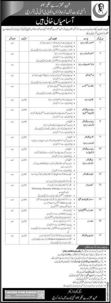 “Apply now for various job opportunities at Shaheed Mohtarma Benazir Bhutto Institute of Technology (SMBBIT), Karachi. Available positions include Assistant, Technician, Designer, and more. Submit applications by 20th October 2025.”