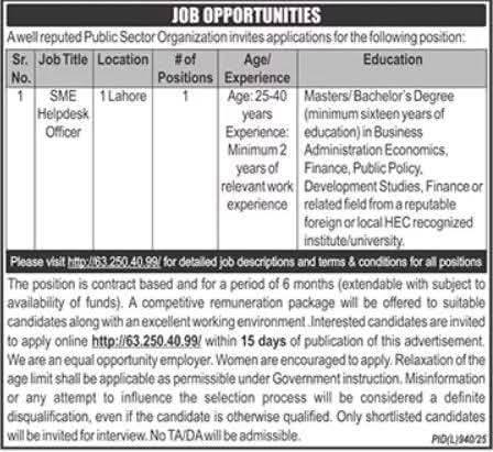 Apply for the SME Helpdesk Officer position in Lahore with a reputable public sector organization. A competitive salary package and opportunities for growth. Minimum 2 years of experience required. Apply by visiting the official job portal.