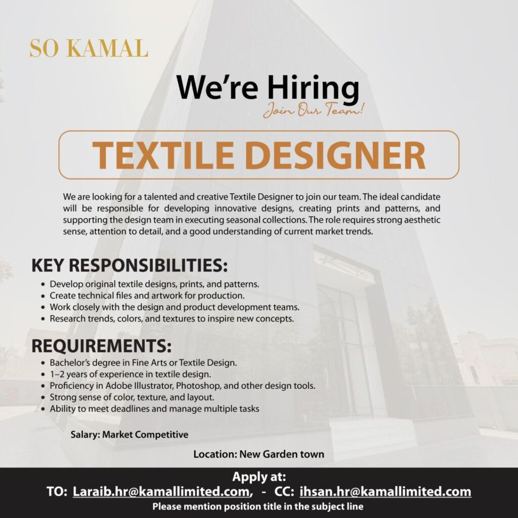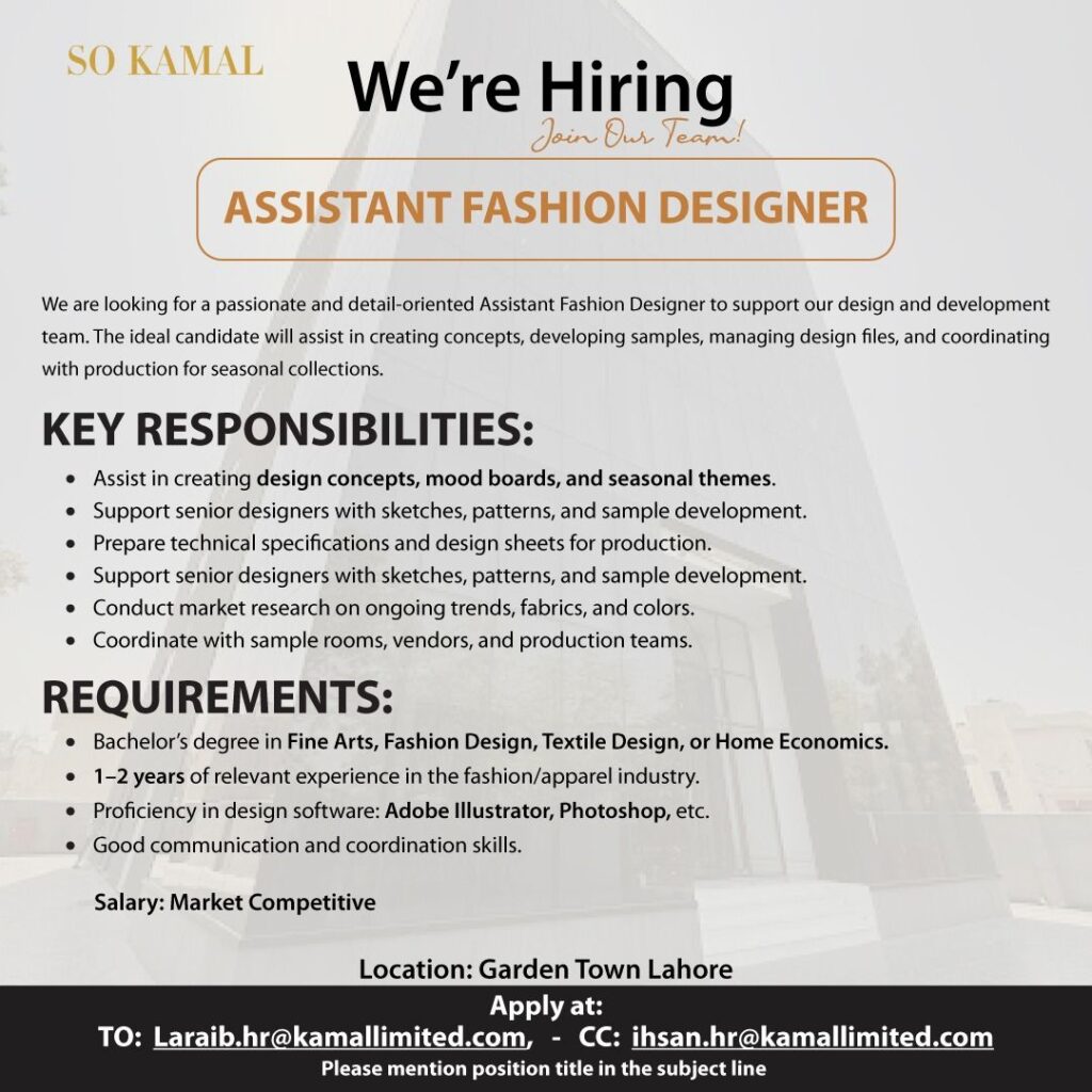 “So Kamal is hiring Assistant Fashion Designers and Textile Designers in Lahore. Join their creative team to work on innovative fashion and textile designs. Apply now for exciting career opportunities in the fashion industry.”