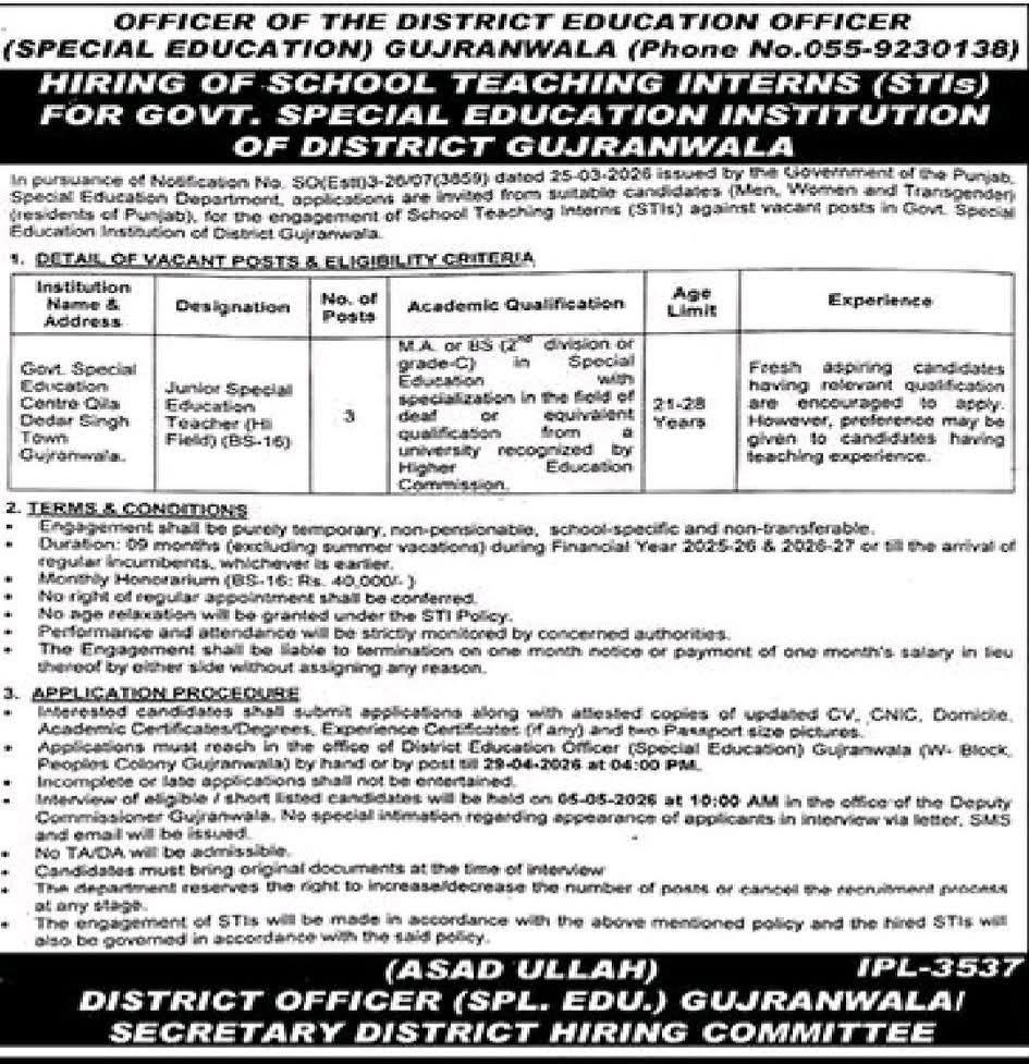 Looking for School Teaching Interns (STIs) vacancies in Punjab? Special Education Department Gujranwala announces Junior Special Education Teacher positions. Apply by April 29, 2026. Check eligibility and application details for Govt Special Education Institution hiring.