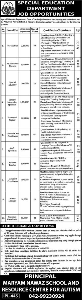 Apply for Special Education Department Punjab Jobs 2026 at Maryam Nawaz School & Resource Centre for Autism Lahore. Vacancies include Psychiatrist, Special Educator, Therapist, Assistant Teacher, and Admin roles on contract basis. Last date to apply is 30 January 2026.