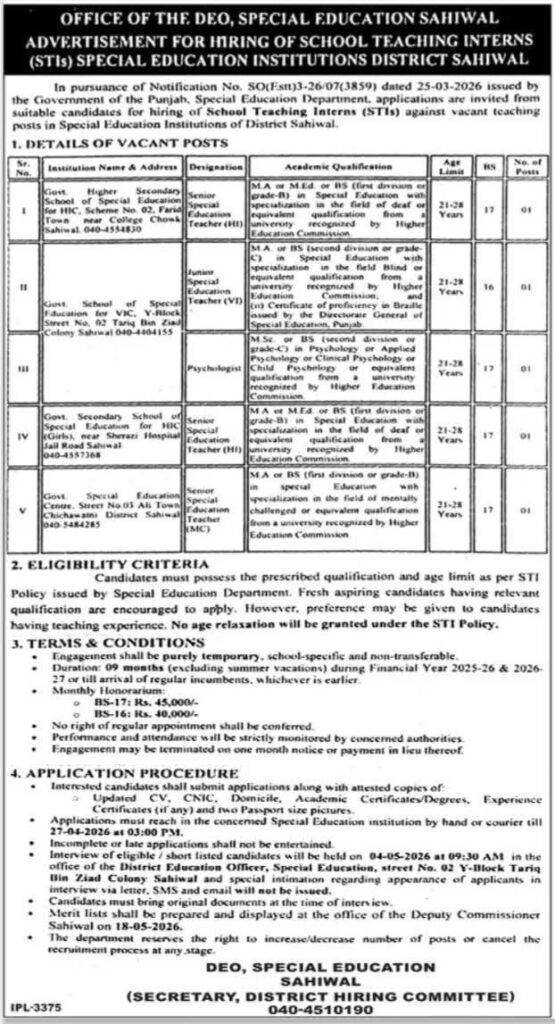 Apply for STI jobs 2026 in Sahiwal Special Education Department. Teaching intern vacancies for SST, JSET, Psychologist. Check eligibility, qualifications, stipend, and deadline.