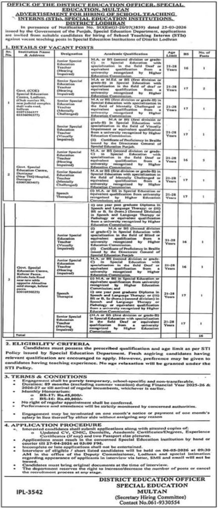 Apply for Special Education STI Jobs 2026 in Lodhran, Punjab. Check vacancies, eligibility, qualifications, age limit, and application deadline for School Education Department internships.