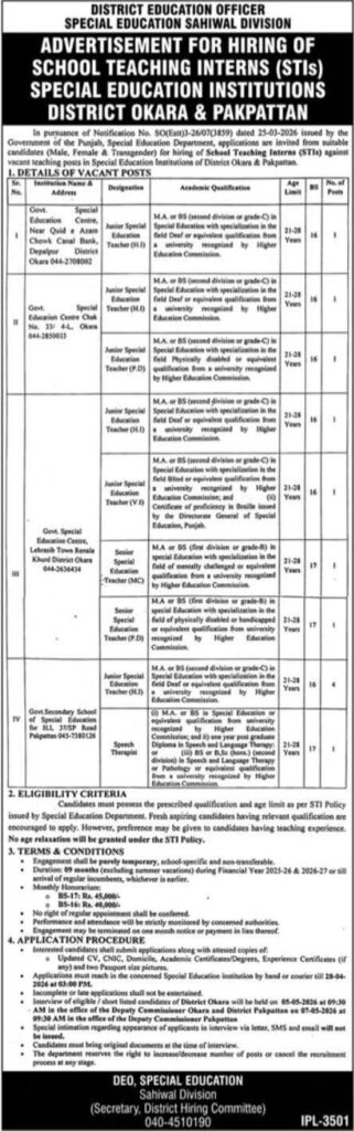 The District Education Officer (Special Education), Sahiwal Division, has announced new job opportunities for School Teaching Interns (STIs) in Special Education Institutions across District Okara and Pakpattan. These internship positions are aimed at supporting students with special needs and offer a monthly honorarium for selected candidates.