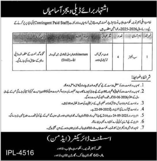 The Punjab Education Department is hiring Sub Engineers (Civil) as Contingent Paid Staff for the academic year 2025–2026. Candidates with a DAE in Architecture or Civil Technology from a recognized institute can apply. A total of 4 vacancies are available on a temporary basis.