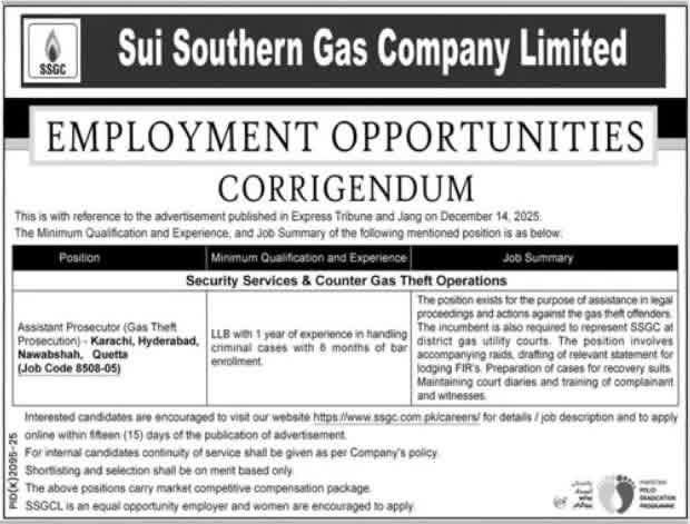 Apply for Sui Southern Gas Company Limited SSGC jobs 2025 corrigendum. SSGC invites applications for Assistant Prosecutor (Gas Theft Prosecution) positions in Karachi, Hyderabad, and Nawabshah. LLB with legal experience required. Check eligibility, job summary, and apply online within 15 days.