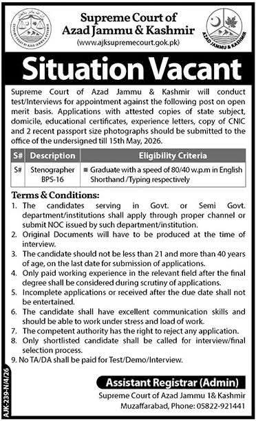 Apply for Supreme Court of Azad Jammu & Kashmir Stenographer Jobs 2026. Check eligibility, typing speed, application process, deadline, and requirements for government jobs in AJK.