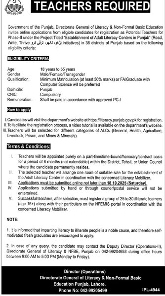 “Apply for teacher positions in Punjab with the Directorate General of Literacy & Non-Formal Basic Education. Positions available in 36 districts, offering competitive compensation. Candidates aged 18-55 are eligible. Apply now!”