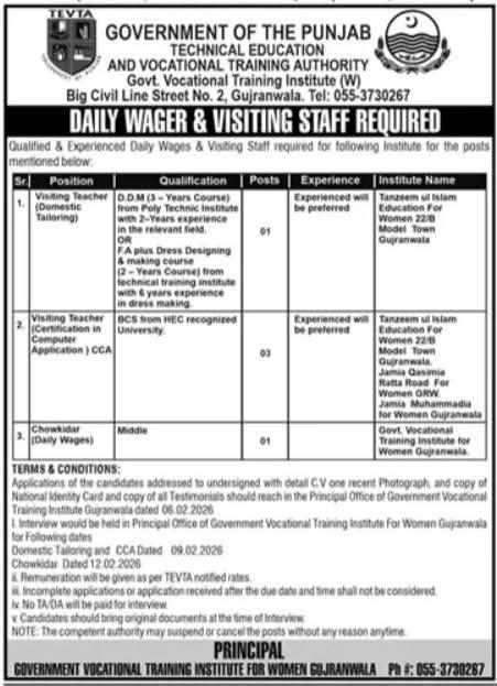 TEVTA Gujranwala Jobs 2026 – Visiting Teachers & Other Positions Available (Daily Wages)