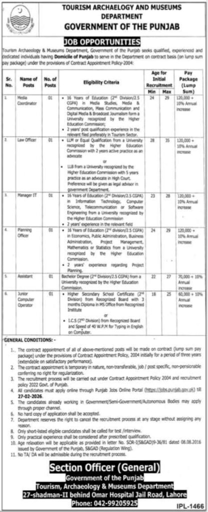 Apply for exciting job opportunities with the Tourism, Archaeology & Museums Department of Punjab. Positions include Media Coordinator, Law Officer, Manager IT, and more. Apply by February 26, 2026.