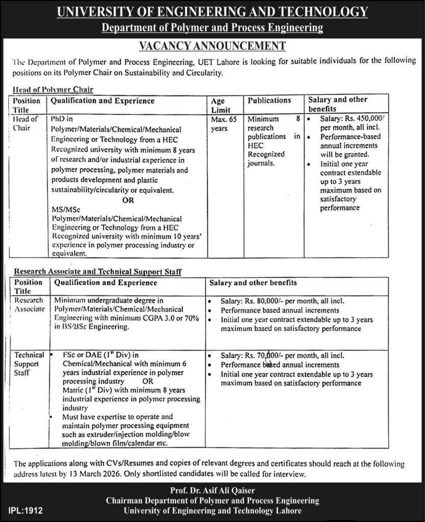 Apply for the Head of Polymer Chair and Research Associate positions at UET Lahore’s Department of Polymer and Process Engineering. Details on qualifications, experience, salary, and deadlines.