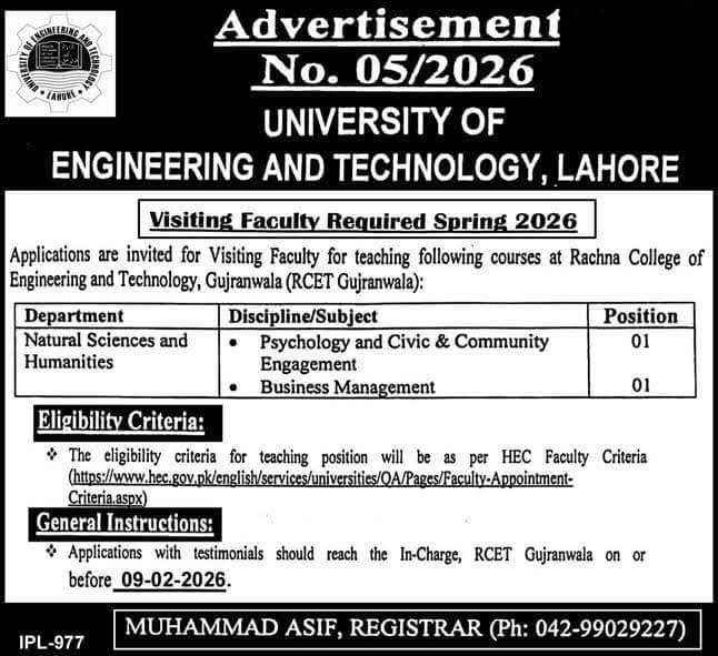 UET Lahore invites applications for Visiting Faculty at RCET Gujranwala for Psychology and Business Management. Check eligibility, posts, qualifications, and deadline for Spring 2026.