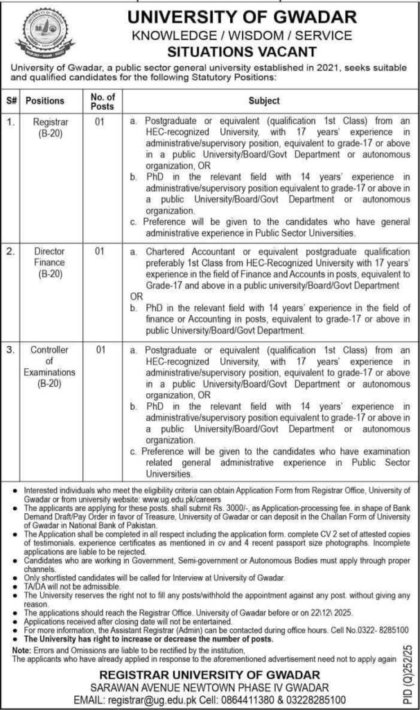 “The University of Gwadar is hiring for key positions such as Registrar, Director of Finance, and Controller of Examinations. Apply by 22nd December 2025 to join this new and prestigious public sector university.”