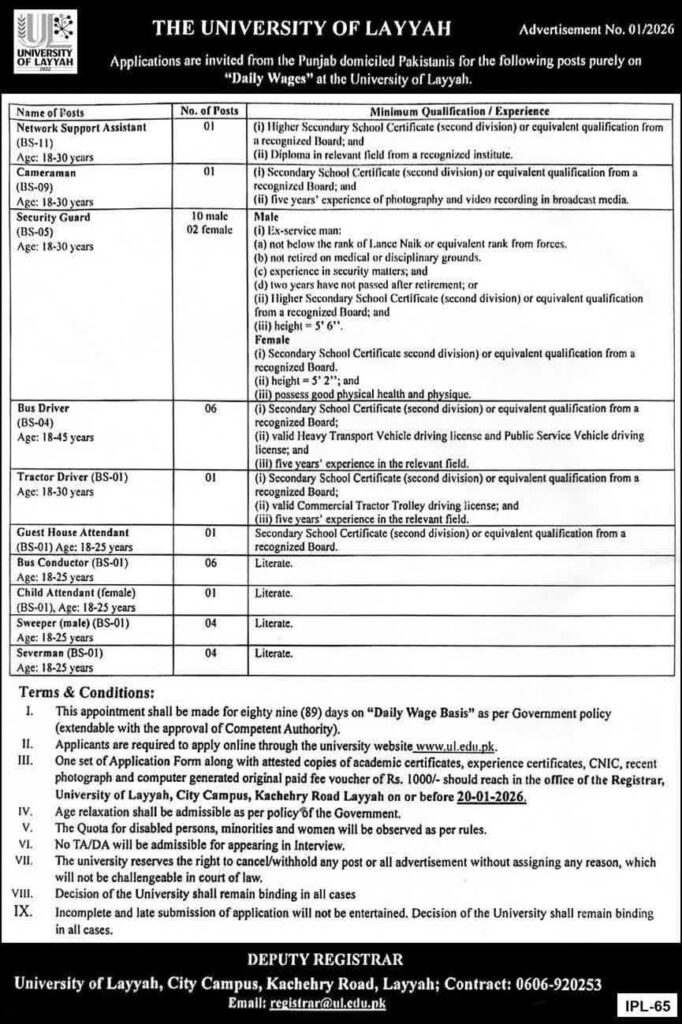 “Explore job opportunities at the University of Layyah for daily wage positions including Network Support Assistant, Cameraman, Bus Driver, and more. Apply now for contract-based roles in various fields.”