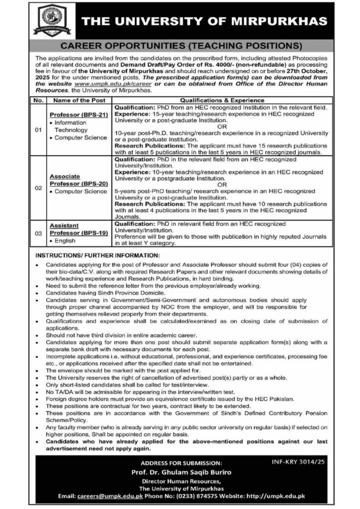 - Contact: Send applications to careers@umpk.edu.pk or visit University of Mirpurkhas.