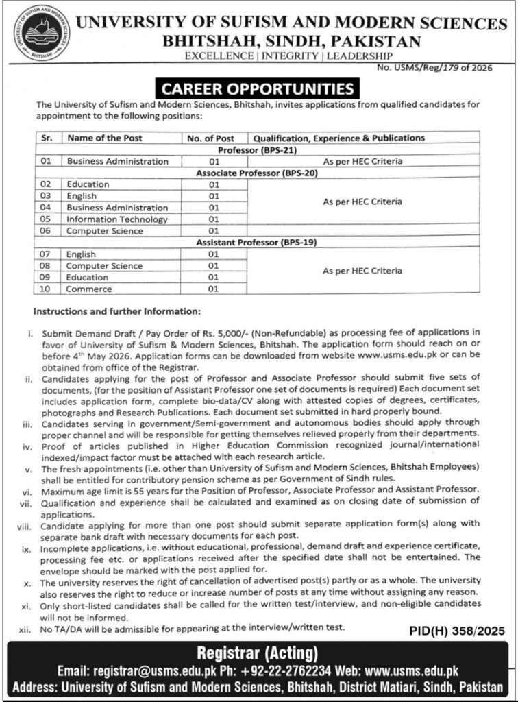 Apply for University of Sufism & Modern Sciences Bhitshah jobs 2026. Faculty vacancies for Professor, Associate Professor, and Assistant Professor in multiple disciplines. Check eligibility, deadline, and application process.