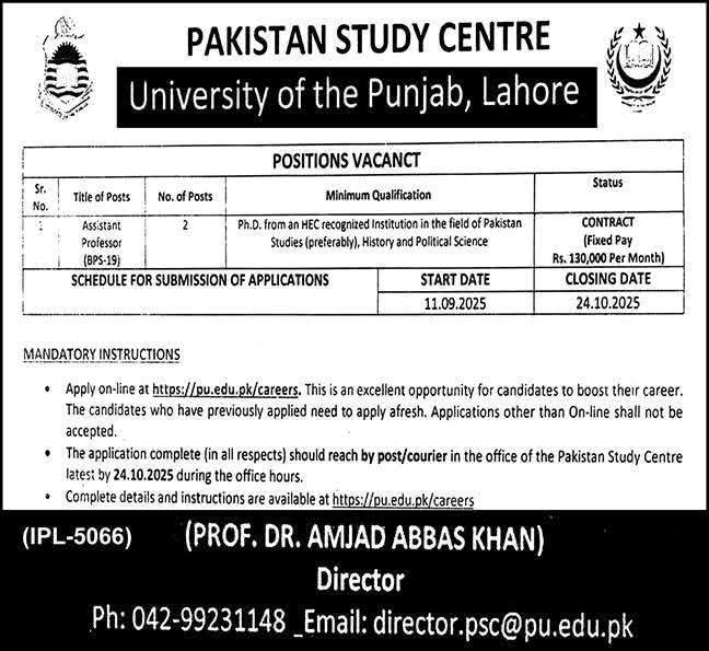 • Submission Method: Apply online at https://pu.edu.pk/careers or submit by post/courier to the Pakistan Study Centre office during office hours.