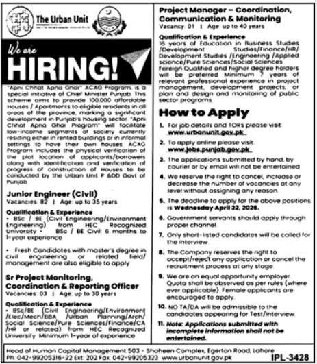 Apply for Urban Unit Jobs 2026 including Project Manager, Urban Planner, and Monitoring Officer roles. Check qualifications, experience, vacancies, eligibility, and deadline. Government jobs in Pakistan.