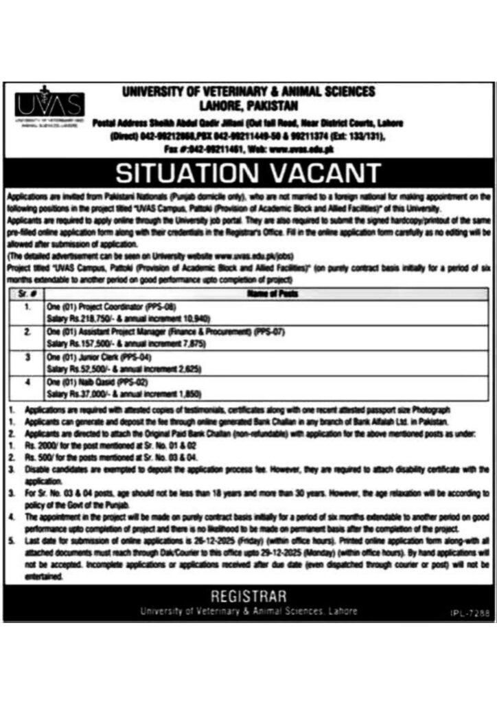 Apply for positions at the University of Veterinary & Animal Sciences, Lahore, for the “UVAS Campus, Patoki” project. Roles include Project Coordinator, Assistant Project Manager, Junior Clerk, and Naib Qasid. Contract-based roles with competitive salaries. Apply by 26th December 2025.