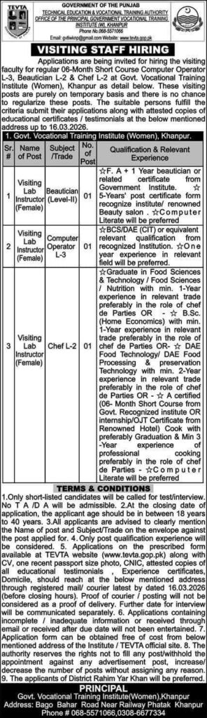 Apply for visiting faculty positions at the Government Vocational Training Institute (Women), Khanpur. Positions available for Computer Operator, Beautician, and Chef Instructor. Submit applications by March 16, 2026.