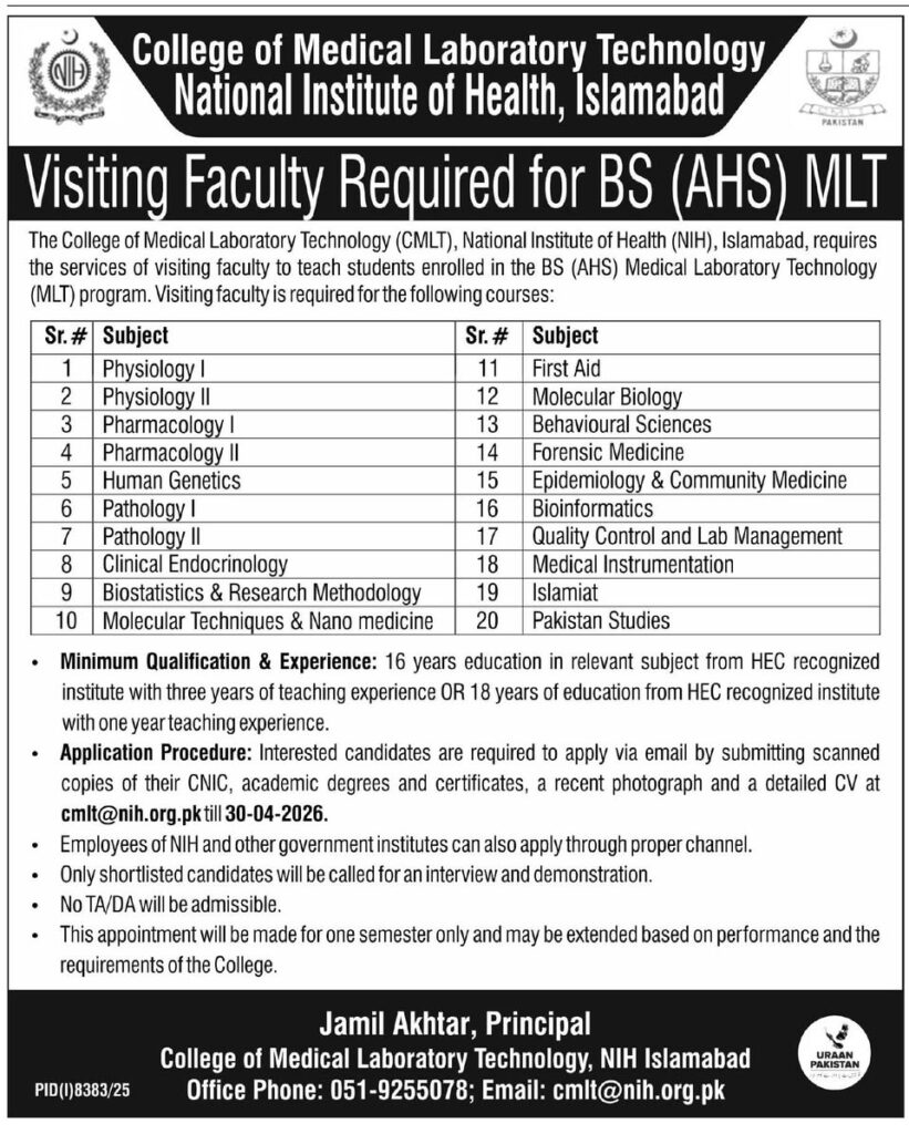 Apply for Visiting Faculty Jobs 2026 at NIH Islamabad for BS (AHS) MLT program. Multiple teaching subjects available. Check eligibility, qualifications, deadline (30 April 2026), and application process.