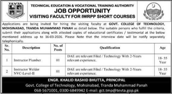 Govt. College of Technology in Mohsinabad is hiring Visiting Faculty for IWRPP Short Courses. Positions are available for Instructor Plumber and Instructor Welder. Applicants must have DAE in relevant fields with 2 years of experience. Apply by 16th March 2026. Age limit: 18-55 years.