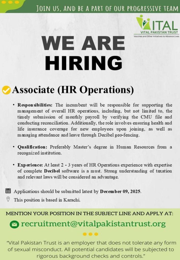 “Vital Pakistan Trust is hiring an Associate (HR Operations) in Karachi. If you have 2-3 years of HR experience and expertise in Decibel software, apply by December 9, 2025. Competitive salary and a progressive work environment.”