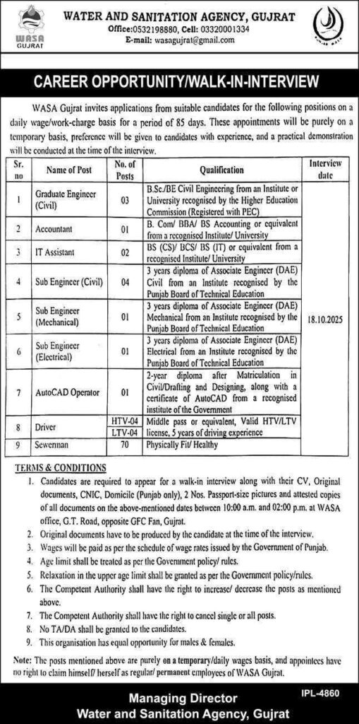 WASA Gujrat is conducting a walk-in interview for multiple positions including Graduate Engineer, IT Assistant, Sub Engineer, and Driver on a temporary daily wage basis for 85 days. Apply by 18th October 2025 for these roles in Gujrat.