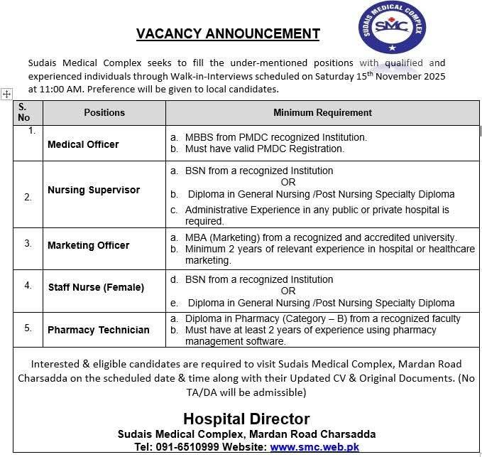 Sudais Medical Complex, Charsadda, invites candidates for walk-in interviews on Nov 15th. Apply for Medical Officer, Nursing Supervisor, Staff Nurse (Female), Marketing Officer, and Pharmacy Technician roles. Local preference given.