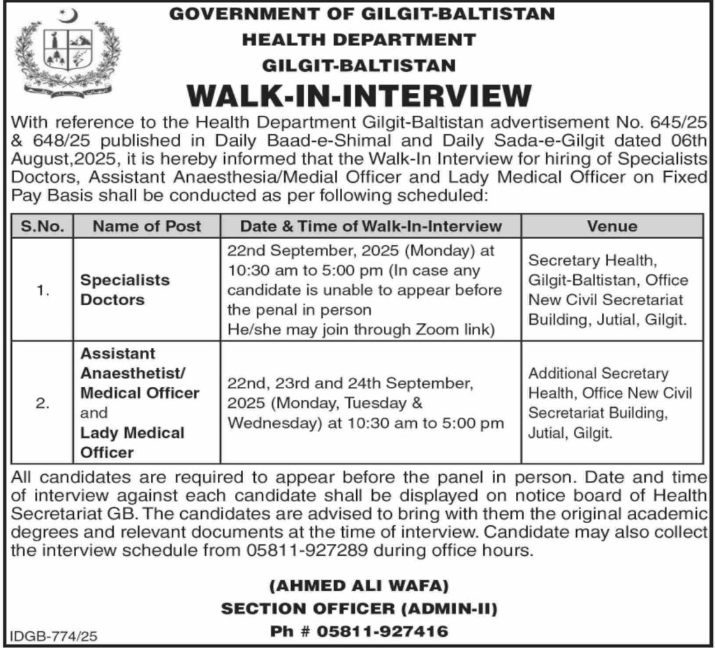 The Gilgit-Baltistan Health Department is conducting walk-in interviews for various medical positions, including Specialist Doctors, Assistant Anaesthetists/Medical Officers, and Lady Medical Officers. These positions are offered on a Fixed Pay Basis, and candidates are encouraged to attend the interviews in person or via Zoom.