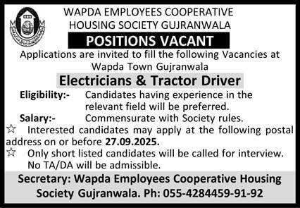Find electrician and tractor driver job openings at WAPDA Employees Cooperative Housing Society in Gujranwala. Apply by 27th September 2025. Competitive salary, eligibility based on experience. No TA/DA.