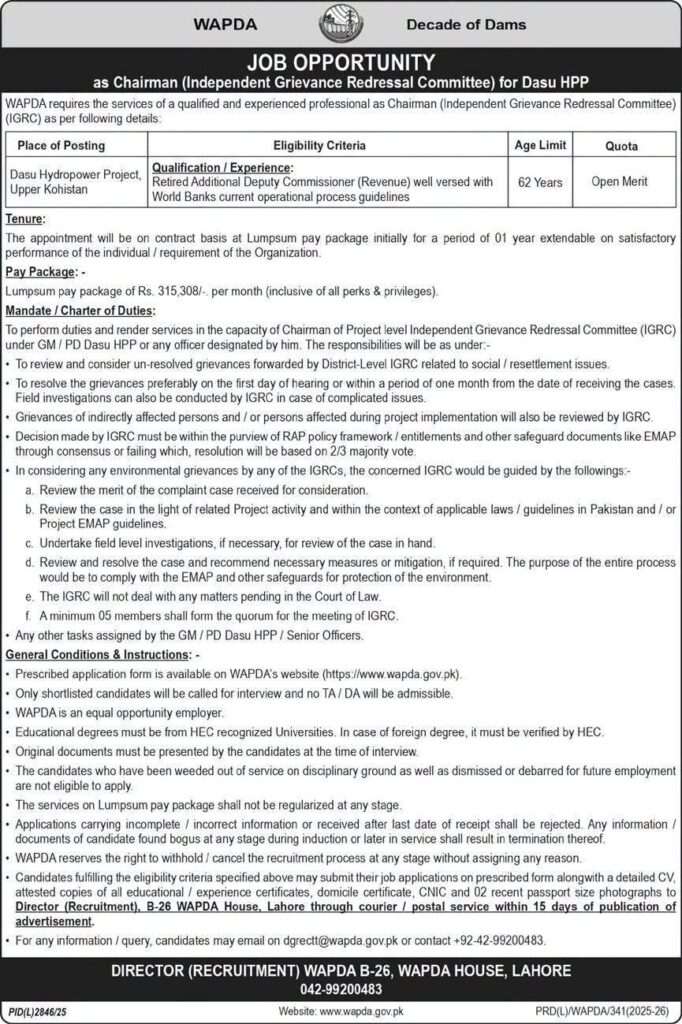 Apply for WAPDA Chairman IGRC job 2025 at Dasu Hydropower Project. Check eligibility criteria, salary package, application process, deadline, and requirements in this detailed guide.