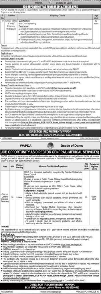 Apply for WAPDA jobs 2026. Latest vacancies for Environment Health & Safety Expert, Advisor Tarbela Hydro, and Director General (Medical Services) across Pakistan. Qualifications, experience, and deadline details provided.